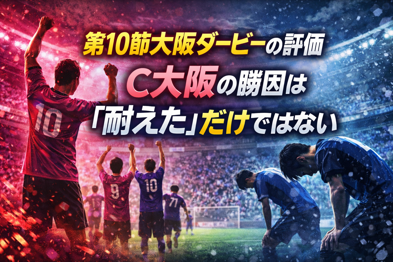 第10節の大阪ダービーは、C大阪の1-0勝利で終わった。評価の結論は、C大阪が「我慢した」では足りない。急な配置変更を得点に結びつけ、GKを含む全員で最後を閉じた勝利だった。G大阪に残った課題は、チャンスを作るところではなく、ダービーを取り返す一撃を決めるところにある。