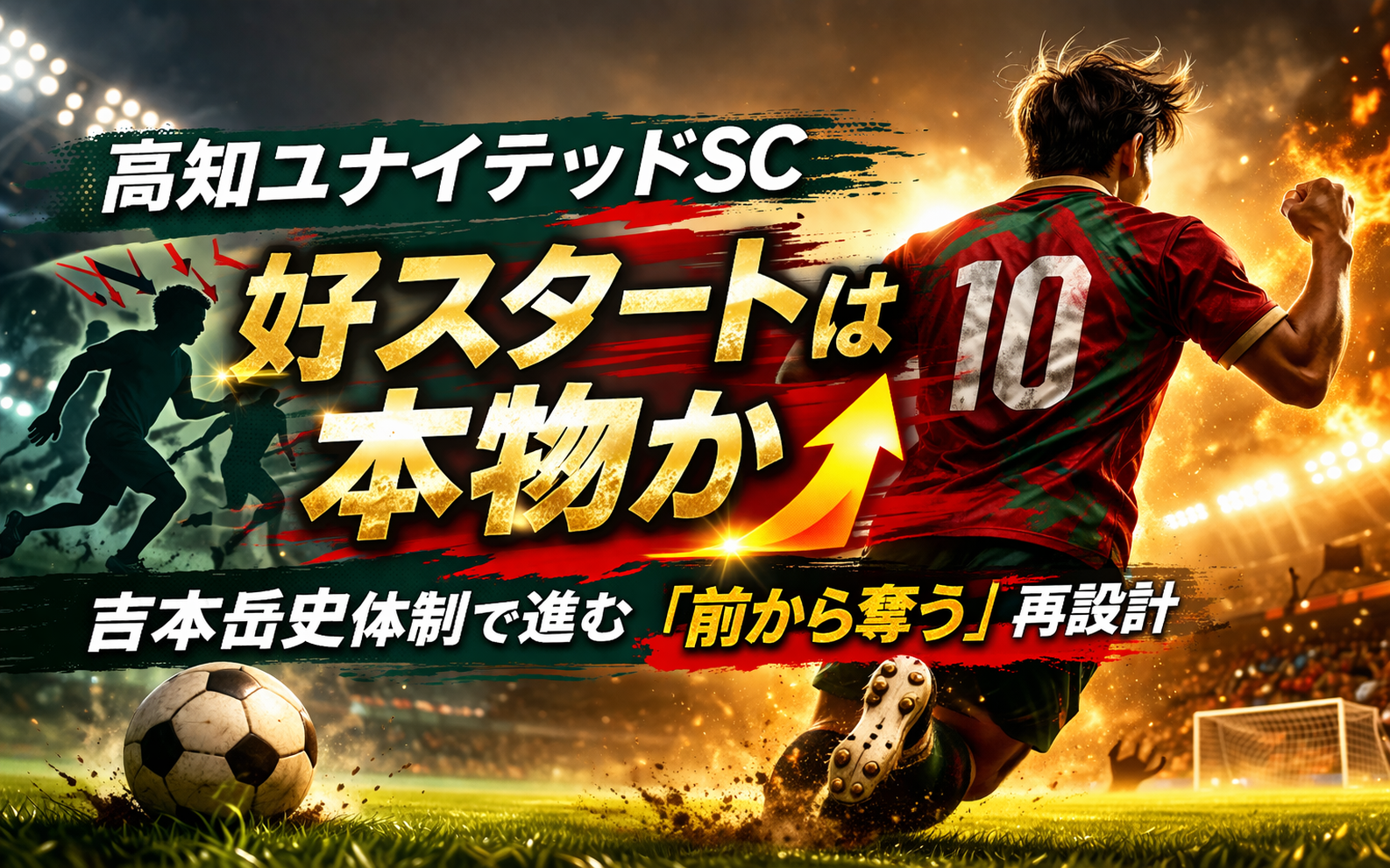 それでも、2026年春のJリーグで「今読む価値があるテーマ」を1つ挙げるなら、高知ユナイテッドSCはかなり有力だ。前年18位のクラブが、保持率ではなく前進力、クロス、複数得点源、そして編成の噛み合わせでここまで景色を変えてきた。その変化は、単なる開幕ダッシュとして片づけるには少し大きい。