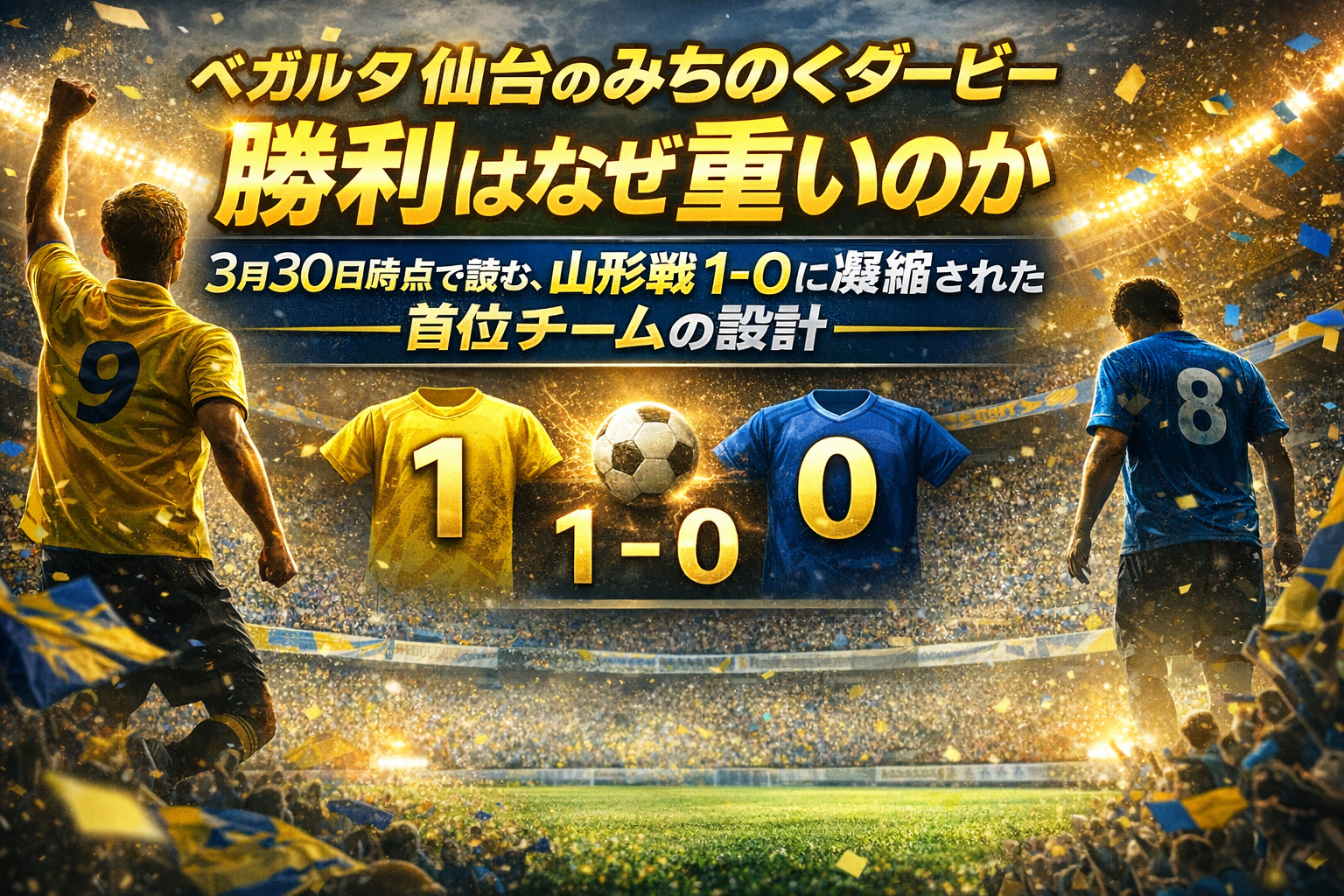 ベガルタ仙台は3月22日のみちのくダービーでモンテディオ山形に1-0で勝利した。スコアだけ見れば最少得点差だが、内容は首位チームらしい管理能力が色濃く出た90分だった。3月30日時点で今の仙台を追う価値がある理由は、勝ったこと自体よりも、相手の変化や試合の熱量に飲まれず、攻守の設計を崩さなかった点にある。