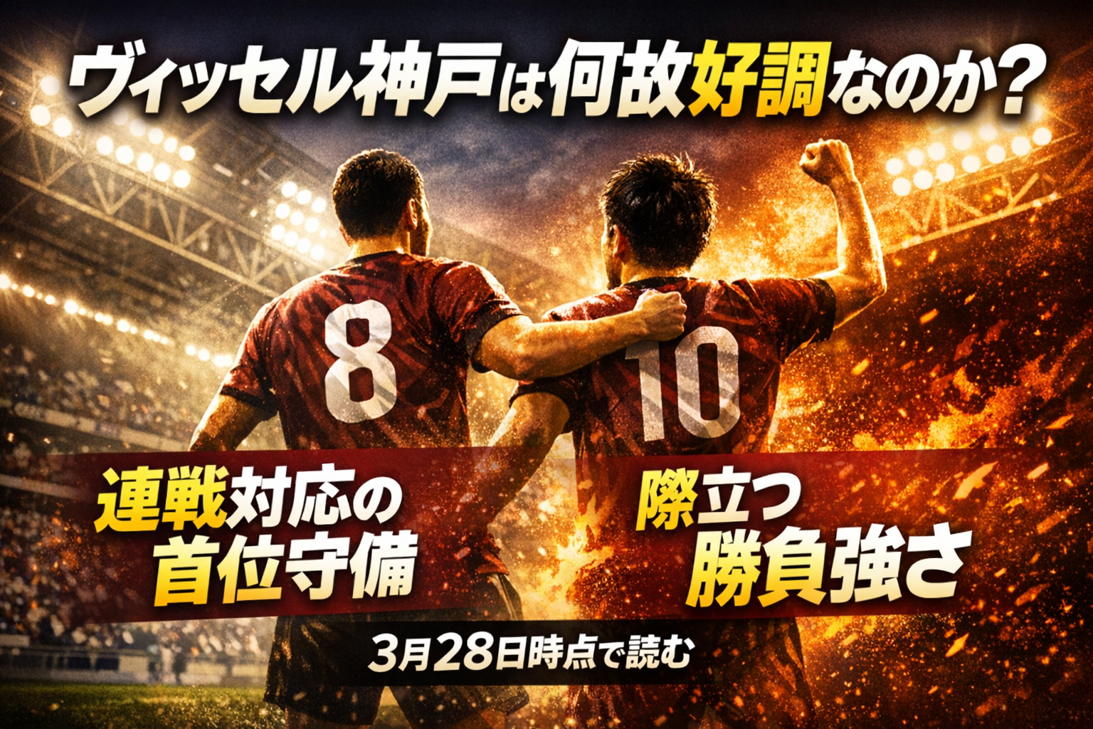 3月27日のサンフレッチェ広島戦でヴィッセル神戸は2-1の逆転勝ち。2026年3月27日21時03分時点の明治安田J1百年構想リーグ地域リーグラウンド(WEST)で首位に立ち、AFCチャンピオンズリーグエリートでも準々決勝進出を決めています。結論から言えば、今の神戸の強みは「連戦でも崩れない守備の土台」と「終盤に勝点を取り切る勝負強さ」、そして新体制でも失われていない前線と中盤のベテラン軸にあります。